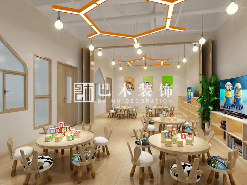 幼兒園室內(nèi)設(shè)計(jì):巴木裝飾盡可能充分利用幼兒園區(qū)內(nèi)空間,在滿足日常教學(xué)情況下,給孩子創(chuàng)造更寬敞的活動(dòng)空間。 配色方面以色彩亮麗自然為主,更好適合幼兒喜好。設(shè)計(jì)同時(shí)以保障幼兒安全為設(shè)計(jì)主旨,以幼兒園本身建筑主體進(jìn)行布局完善,滿足功能同時(shí)掩蓋安全隱患。